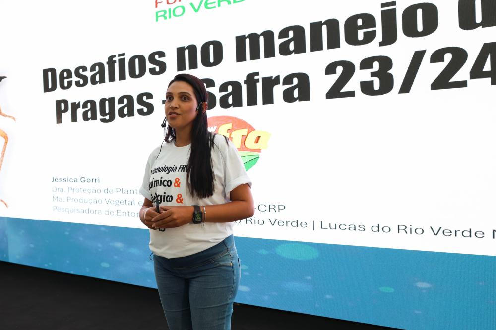 Uma das abordagens mais promissoras destacadas na palestra, proferida pela pesquisadora, Dra Jéssica Gorri foi o controle de pragas do sistema soja, milho e algodão. “A Fundação Rio Verde tem investido em pesquisas para identificar momento correto de aplicação e melhor fase da praga para altas eficiências de controle.“