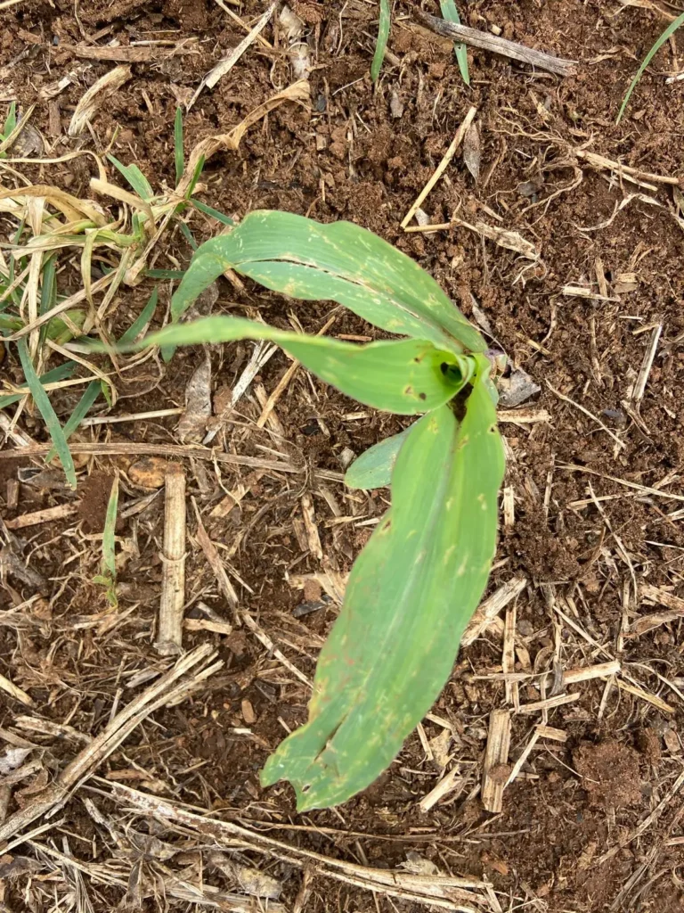 Se o meristema apical não for danificado, as primeiras folhas que emergem do cartucho podem apresentar estrias esbranquiçadas transversais, muitas vezes com perfurações de halo amarelado, causadas pelas puncturas feitas pelo inseto durante a alimentação na base da planta jovem. Quando as folhas do cartucho não conseguem se desenrolar, a planta pode adquirir um aspecto de “encharutamento”.
